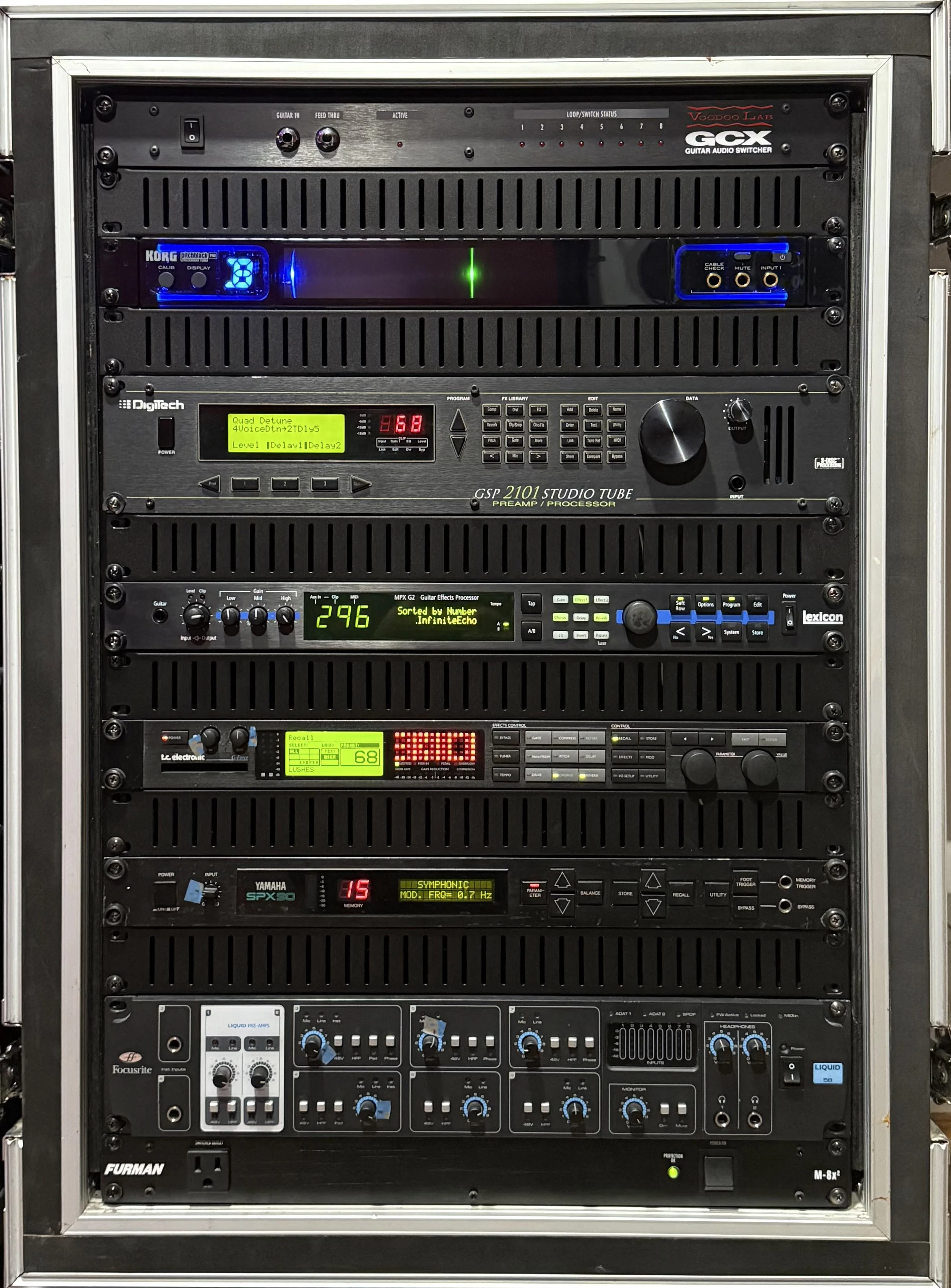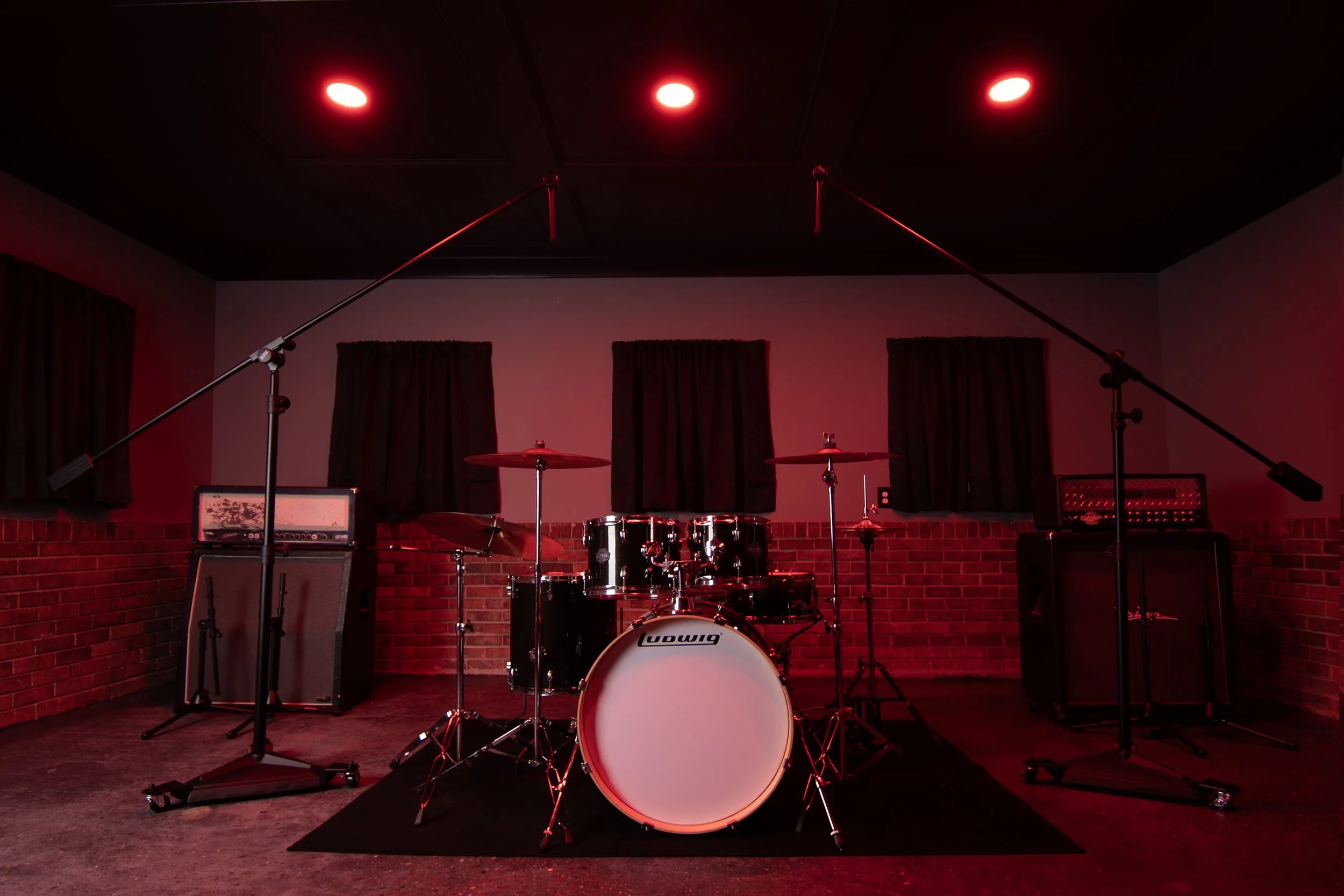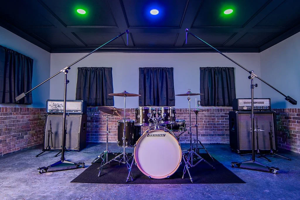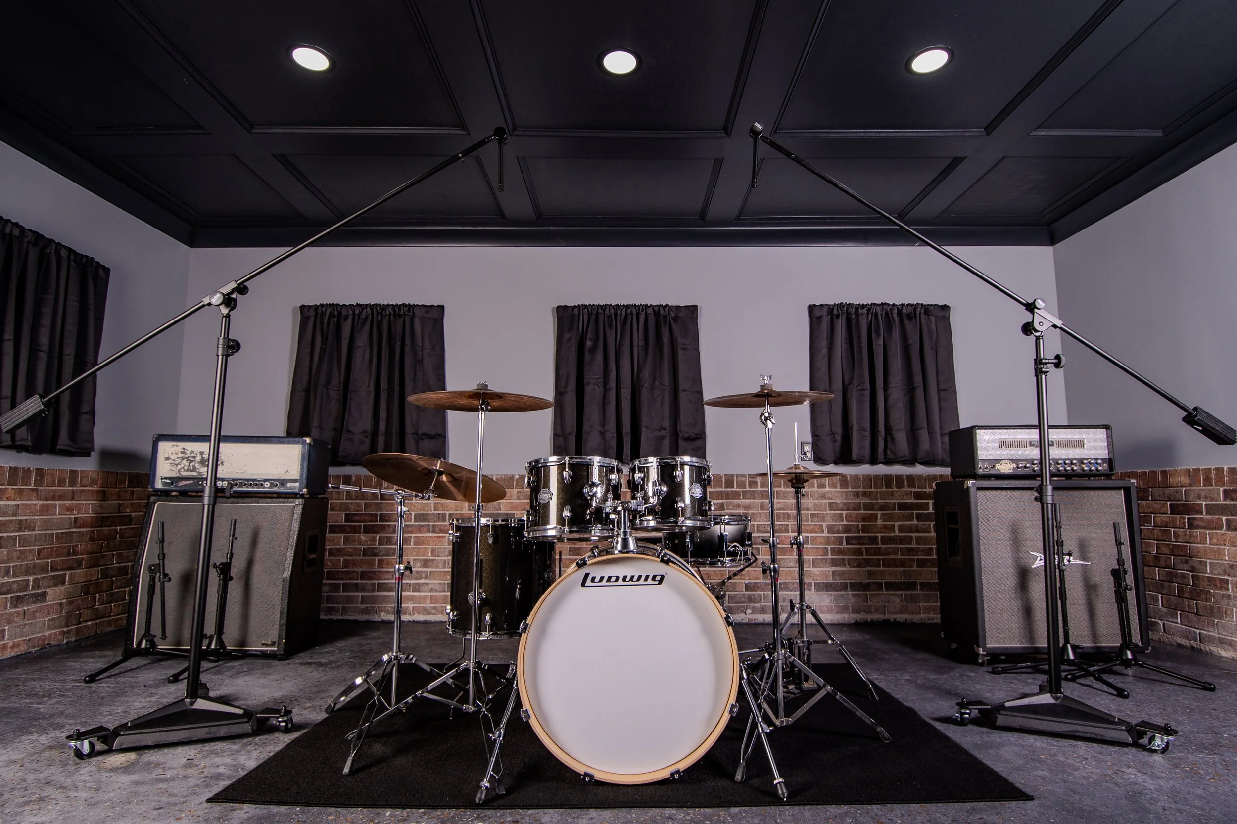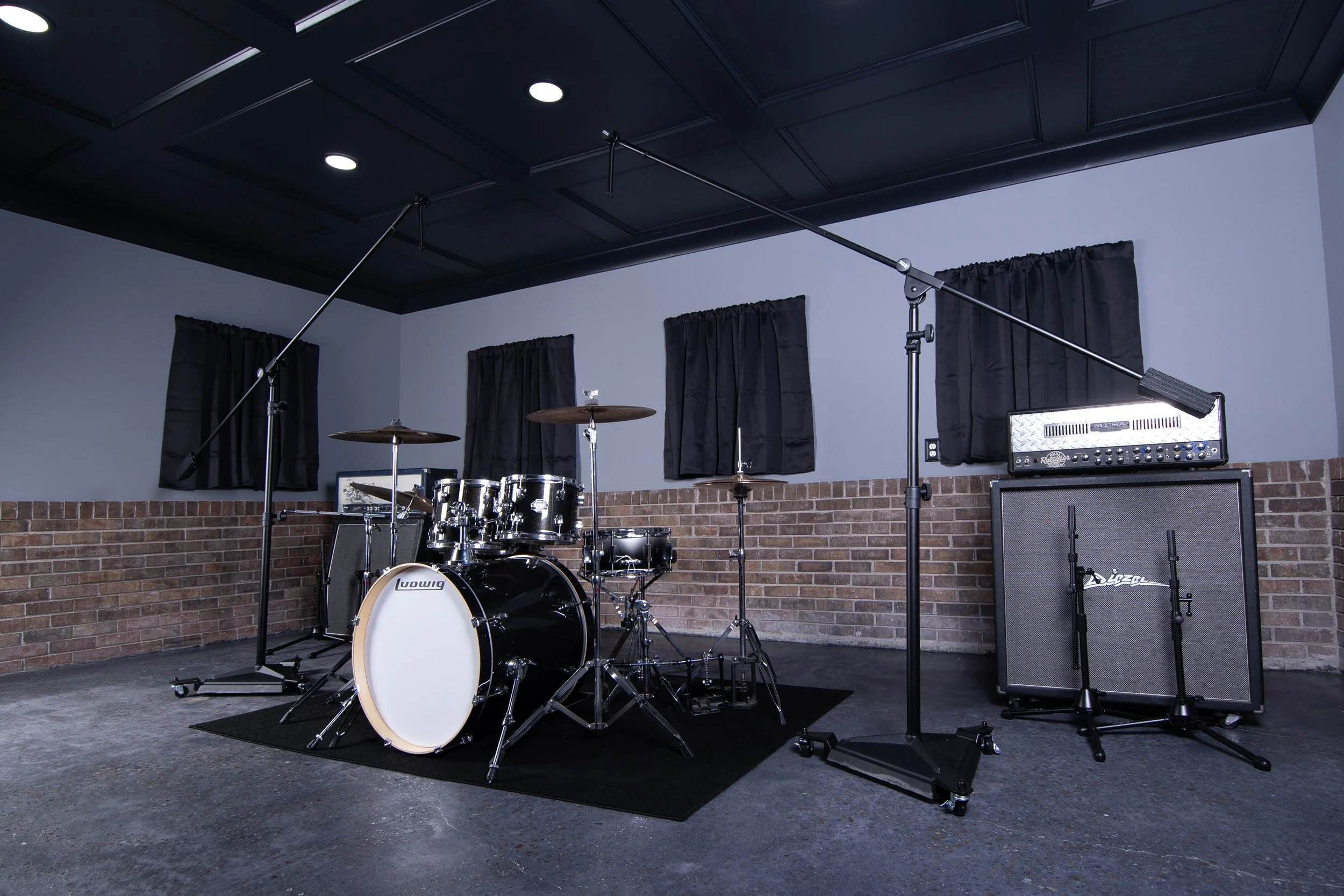 G9’s live tracking room is 18’ x 20’ half brick with concrete floors and wooden coffered ceiling, five piece Ludwig drum set, Mesa Deizel 4x12 guitar cab, Aviom individual headphone system.